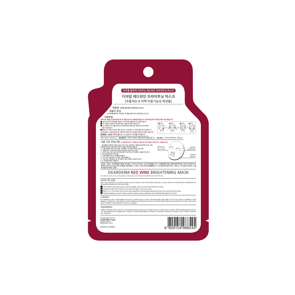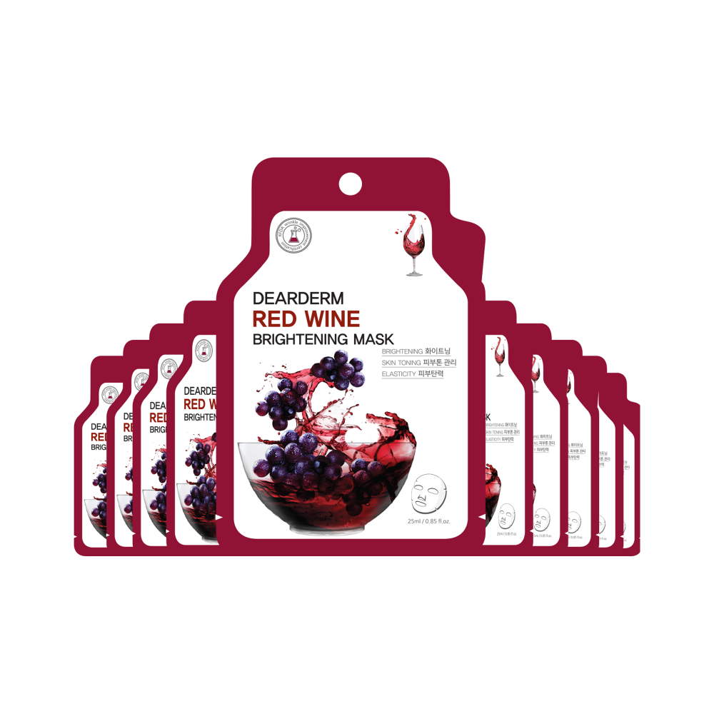 Dearderm Red Wine Brightening Mask 25ml / 0.85fl.oz Brightening, Skin Toning, and ElasticityThis mask contains red wine polyphenol components which help to brighten and soften the skin