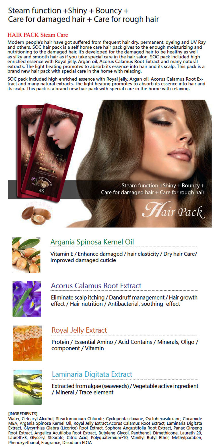 SOC hair pack is a self-home hair pack that provides enough moisture and nutrition to damaged hair. It has been made for damaged hair to become healthy, silky and smooth just like in the hair salon. SOC hair pack contains high enriched essence with royal jelly, argan oil, Acorus calamus root extract, and many natural extracts. The essence absorbs well into the hair and scalp. This is a brand new hair pack with special care that can be done in the home with relaxation.