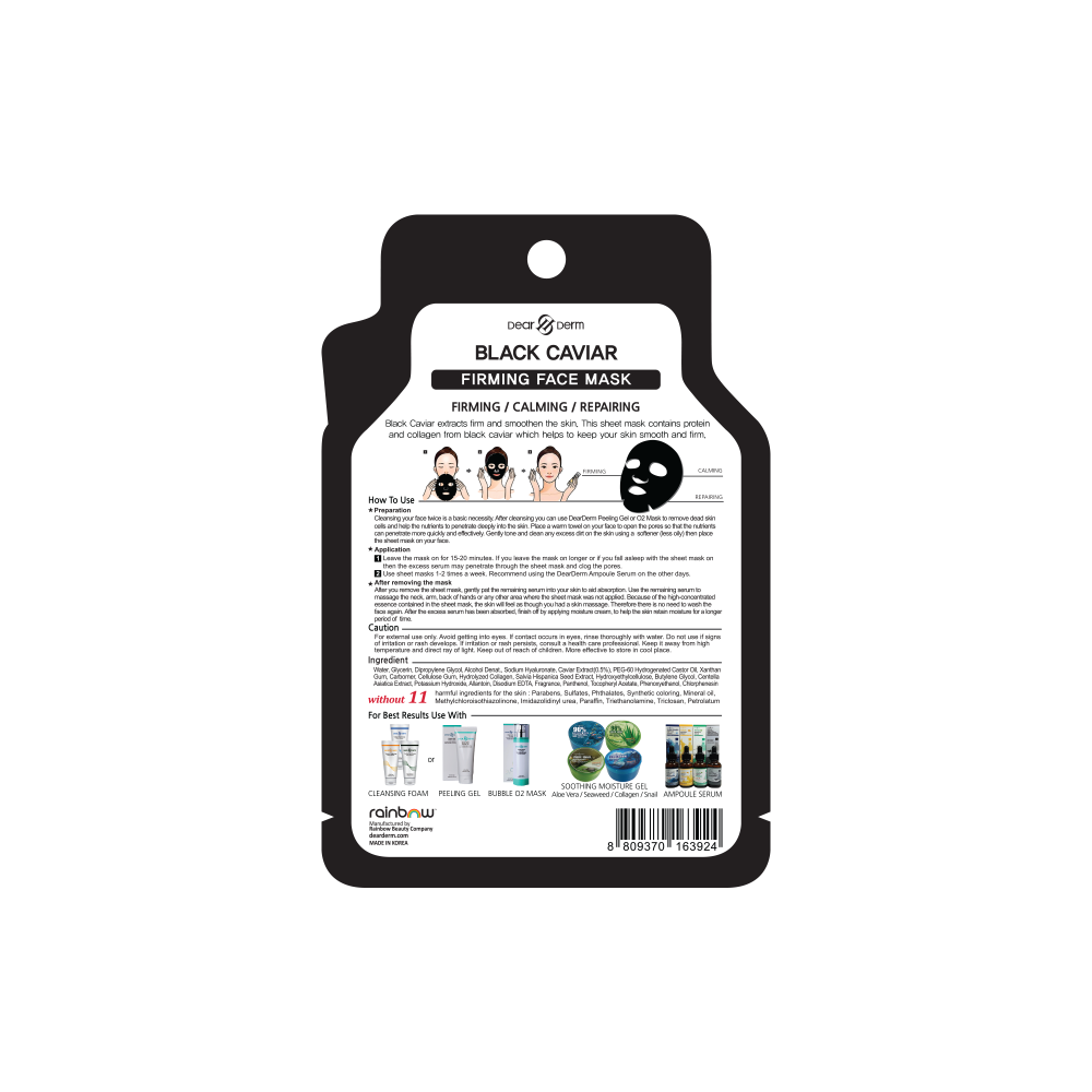 Black caviar extract firms and smoothens the skin. This sheet mask contains protein and collagen from black caviar which helps your skin be smooth and firm.How To Use