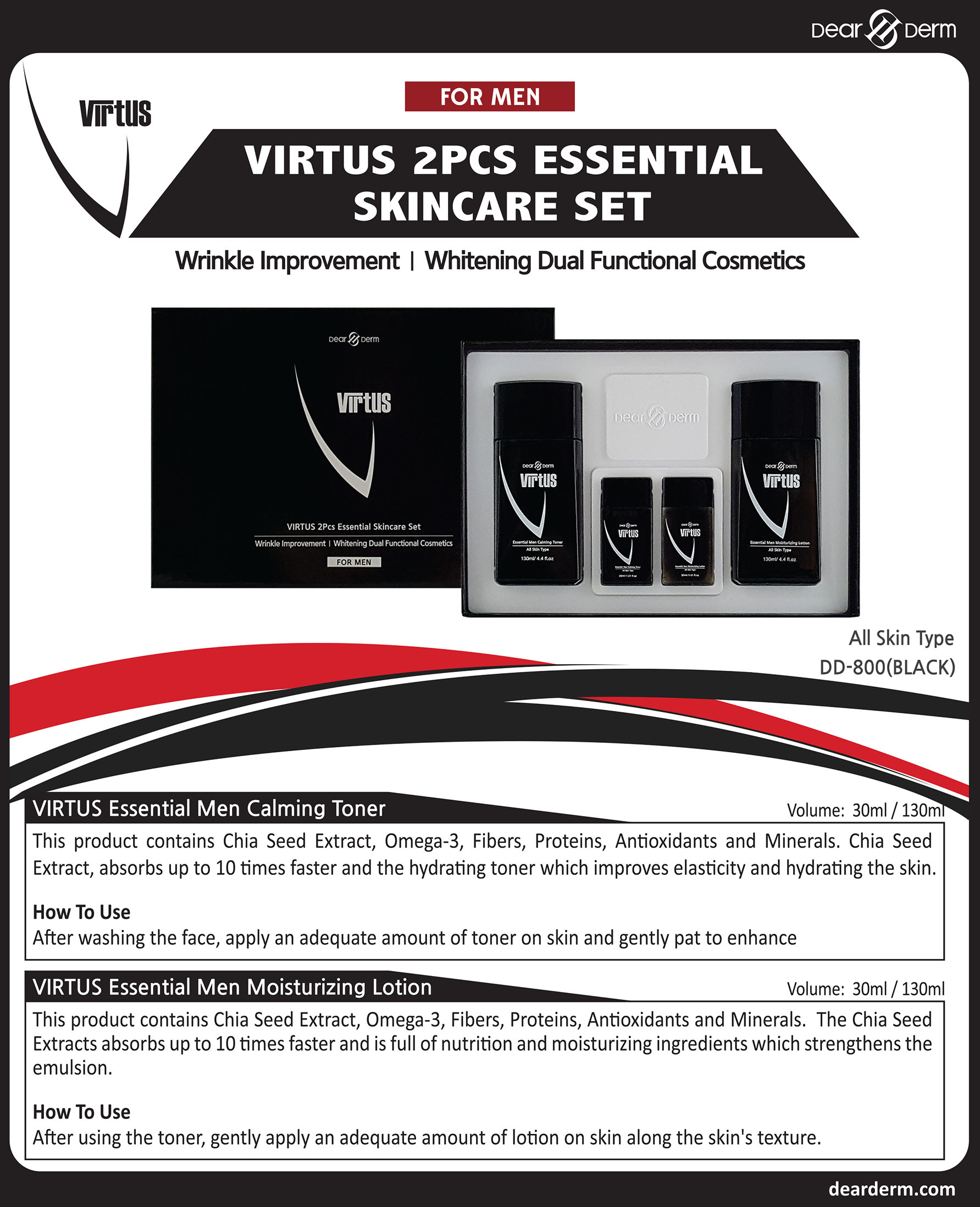 This product contains Chia Seed Extract, Omega-3, Fibers, Proteins, Antioxidants, and Minerals. Chia Seed Extract absorbs up to 10 times faster and the hydrating toner improves elasticity and hydrates the skin.DearDerm Virtus Essential Men Calming Toner - 130ml / 4.4fl.oz.